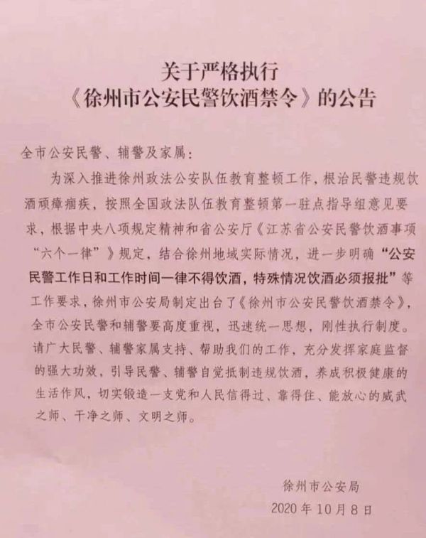 江苏徐州:即将发布实施《徐州公安民警饮酒禁令》