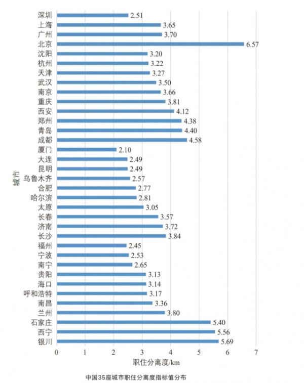 职住分离度以km为单位,指理论上能够实现的最小通勤距离(不考虑就业差异与人的选择,在既有职住分布状态下通过交换就业地)。而市民的实际通勤还受到土地开发政策、居民收入、交通系统可达性等因素的影响。