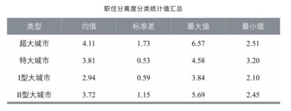 35座大城市中包含4座超大城市、10座特大城市、10座Ⅰ型大城市和11座Ⅱ型大城市。职住分离度在统计上并未出现随城市规模增长而逐渐增加的情况。