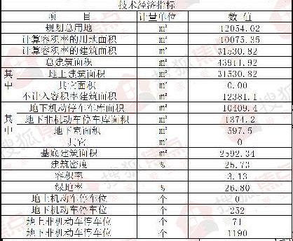 根据经济技术指标表显示,该项目居住总用地面积12054.02平方米(约合18.08亩),总建筑面积为43911.92平方米(约合65.87亩),建筑密度25.73%,绿地率26.80%,容积率3.13,地上机动车停车位0个,地下机动车停车位252个,地上非机动车停车位71个,地下非机动车停车位1190个。