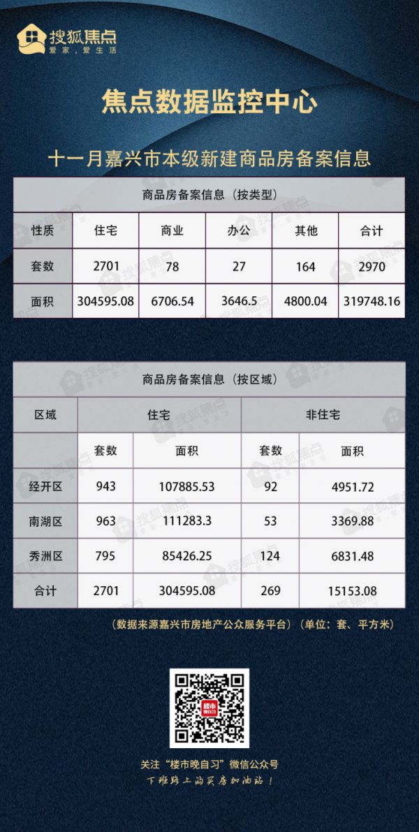 住宅方面,经开区住宅备案943套,南湖区住宅备案963套,秀洲区住宅备案795套,共计备案面积约30.5万方。