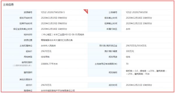 2020年12月21日10:08分,永州市城投房地产开发有限责任公司以最高报价29670万元竞得中心城区长丰工业园片B-02-06-01号地块(资源编号 YZGZ-2020GTWG058-5)。