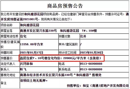 1月12日,位于南通市开发区复兴东路330号的和风雅颂再次领取预售许可证,预售许可证号:通开发房预售证第2021001号。本次开盘推出7#、10#,共计13356m²。住房均价20900元/m²。