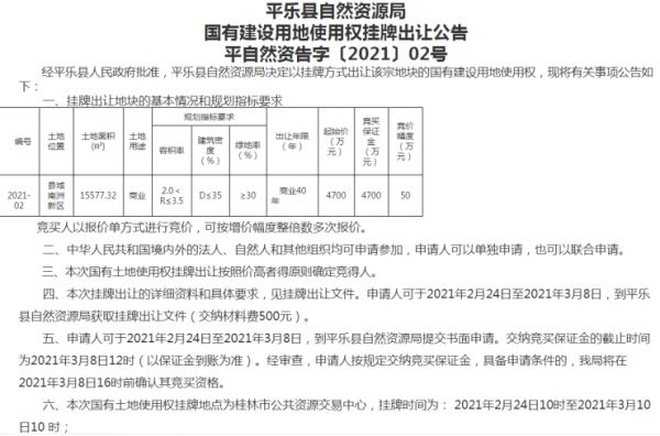 这三宗土地分别是位于平乐县城南洲新区编号为2021-02的商业用地,土地面积15577.32平方米,容积率2.0<R≤3.5,出让年限40年,起拍价4700万元,挂牌时间为: 2021年2月24日10时至2021年3月10日10 时。