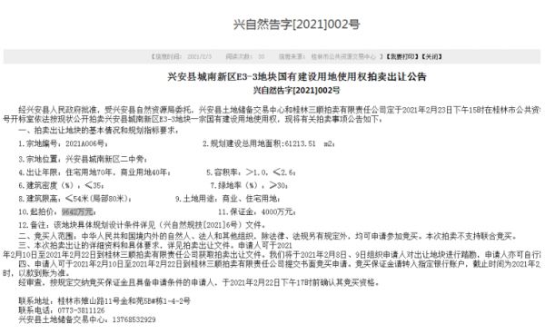 兴安县城南新区二中旁编号为2021A006的商住用地,土地面积:61213.51平方米,容积率:>1.0,≤2.6,出让年限:住宅用地70年,商业用地40年,起拍价9642万元。
