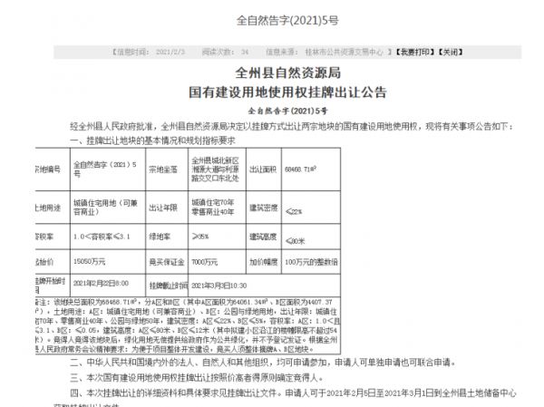 而位于全州县城北新区湘源大道与利源路交叉口东北处的城镇住宅用地(可兼容商业),编号为全自然告字(2021)5号,土地面积68468.71㎡,容积率:1.0<容积率≤3.1,出让年限城镇住宅70年,零售商业40年;起拍价15050万元。