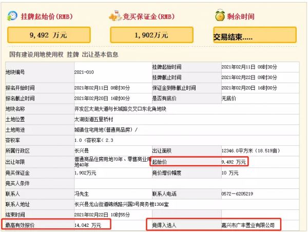 2月22日,位于长兴的2021-010地块被嘉兴市广丰置业有限公司以总价约1.4亿竞得,成交单价约11374元/㎡,折合楼面价4945元/㎡,溢价率约47.9%。