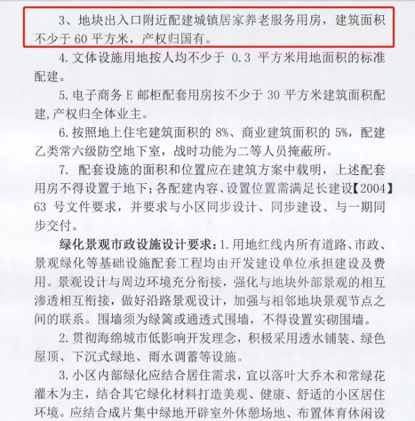 地块出入口附近配建城镇居家养老服务用房,建筑面积不少于60㎡,产权归国有。