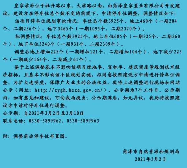 近日菏泽市自然资源和规划局发布关于拟对皇家学府停车位调整的公示具体内容如下