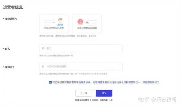 第四步按照页面填写所需的营业执照、企业明星,营业执照的注册号,还有所需要的账号确认书,在该页面【点击下载】上传填写打印好之后上传,还有运营人的身份证正反面,点击按钮等待系统审核。