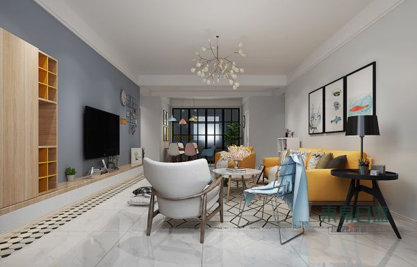 客厅摆放一张黄色的沙发,一抹抹清新的亮色沁人心脾。