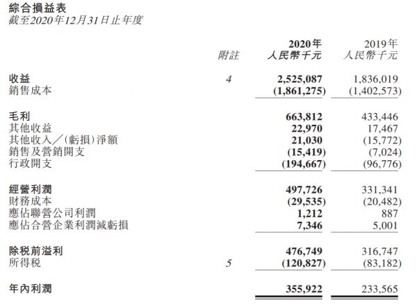 据报告,2020年收入约为25.25亿元,较2019年约人民币18.36亿元增长37.5%;毛利约为6.64亿元,较2019年的4.33亿元增长53.2%;毛利率为26.3%,而2019年毛利率为23.6%,按年提升2.7个百分点。