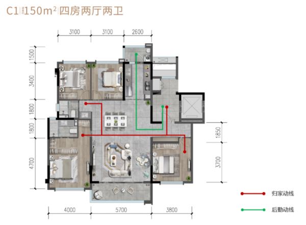 再看看建面约150㎡的四房产品,三开间朝南,经典竖厅开间约5.7米,主卧开间约4米,朝南次主卧开间约3.8米,其余两间次卧开间均为约3.1米。主要空间的尺寸表现可以媲美市场上不少170㎡高层产品。核心逻辑,依然是高得房率。