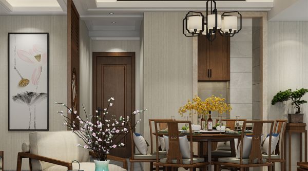 餐厅吊灯巧妙融入了现代元素与传统文化元素表达当代艺术审美。椅子遵循自然简约法则,简练的线条配以素白的软垫,衬以黄色花艺,为用餐空间增添了几分自然凝结的意境之美。