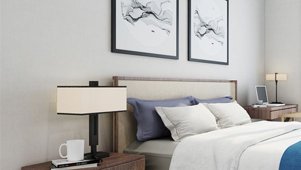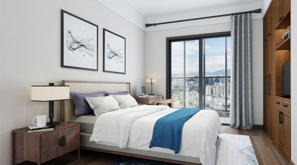 山水挂画内敛中透着悠然气质。木制地板、柜体的硬实与蓝白地毯、舒适床品的柔软相搭,融合简约的现代风与雅澹的中式元素,让空间的质感构成平衡,体现的不仅仅是生活的品味,更是生命的品味。