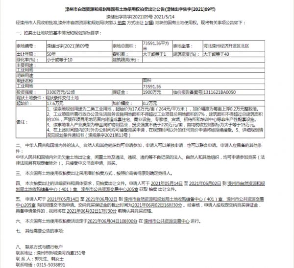 滦州市自然资源和规划局国有土地使用权拍卖出让公告
